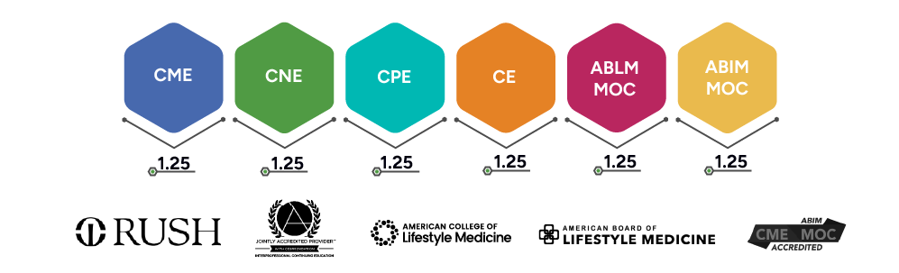 Joint Providership Statement: In support of improving patient care, this activity has been planned and implemented by RUSH University Medical Center and American College of Lifestyle Medicine. RUSH University Medical Center is Jointly accredited by the Accreditation Council for Continuing Medical Education, Accreditation Council for Pharmacy Education (ACPE), and the American Nurses Credentialing Center (ANCC) to provide continuing medical education for the healthcare team.