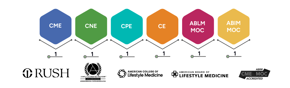 Joint Providership Statement: In support of improving patient care, this activity has been planned and implemented by RUSH University Medical Center and American College of Lifestyle Medicine. RUSH University Medical Center is Jointly accredited by the Accreditation Council for Continuing Medical Education, Accreditation Council for Pharmacy Education (ACPE), and the American Nurses Credentialing Center (ANCC) to provide continuing medical education for the healthcare team.